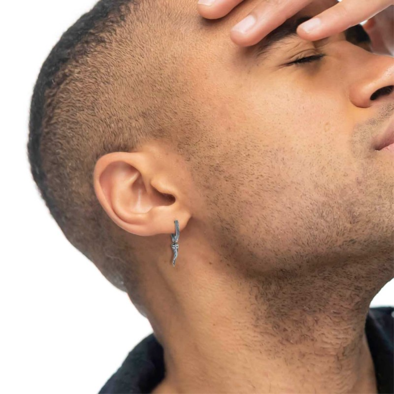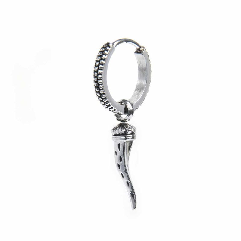 Monorecchino uomo marlù, 33OR0044-N, collezione vision, in acciaio a cerchio con diametro 1, 5 cm con trama puntinata in black oil opaco e con pendente a forma di corno con trama con black oil.