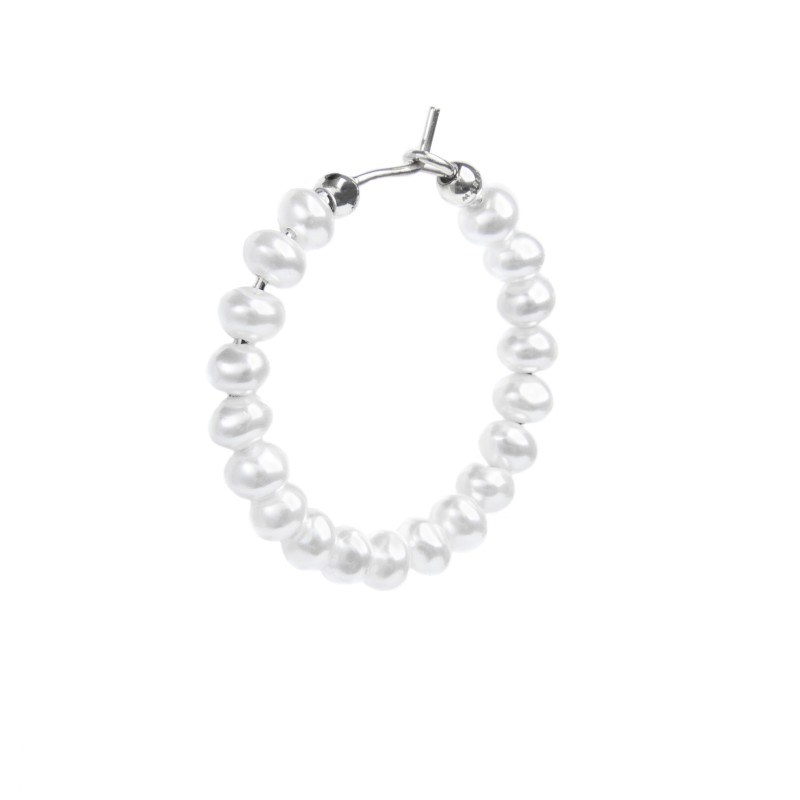 Monorecchino donna marlù, 33OR0060-W, collezione vision, a cerchio in acciaio con diametro 2, 8 cm con perle bianche irregolari rivestite, all'estremità due sferette di acciaio, su una delle quali è presente il logo Marlù.