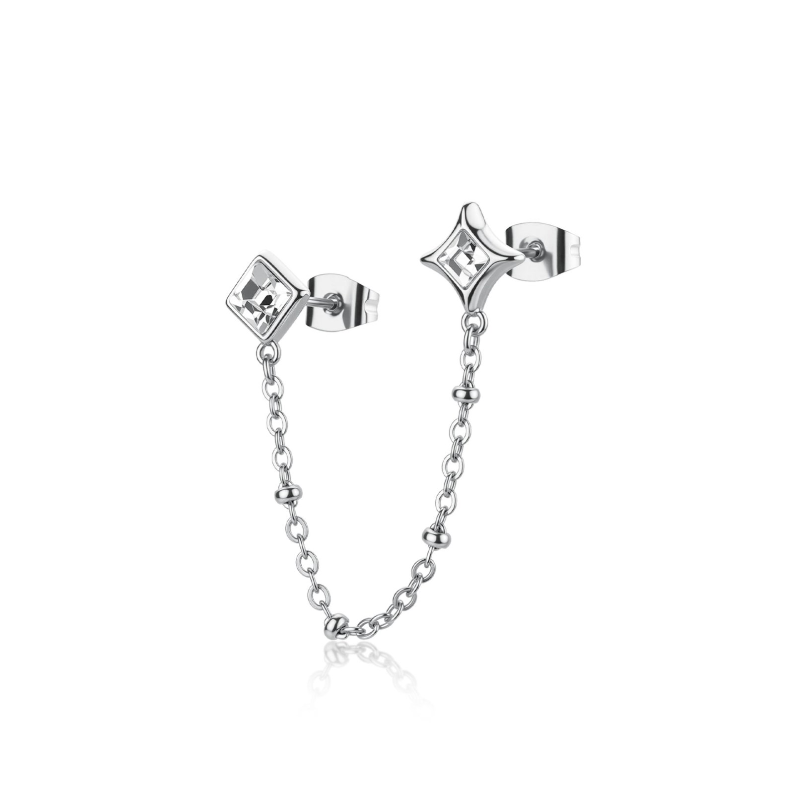 Monorecchino donna sagapò, SCE58, collezione luce, a doppio buco in acciaio 316L con catena e cristalli.