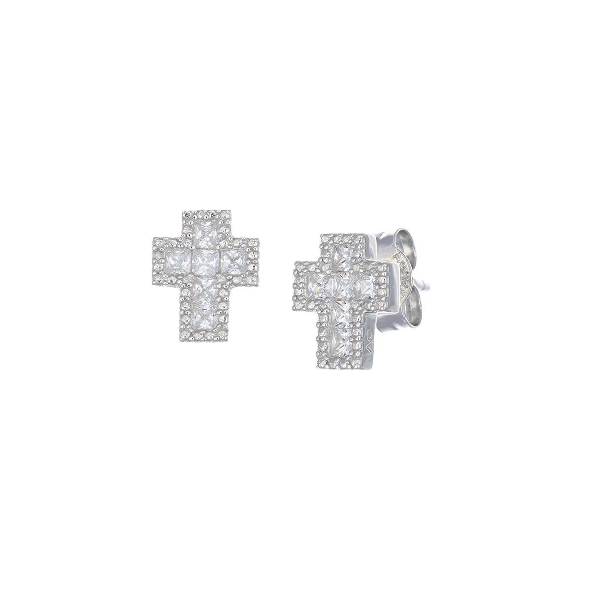 Orecchini donna amen, ECRREBBBZ, collezione croci, in Argento 925 rodiato, Zirconi centrali con taglio carrè, Chiusura a farfallina, altezza 8mm