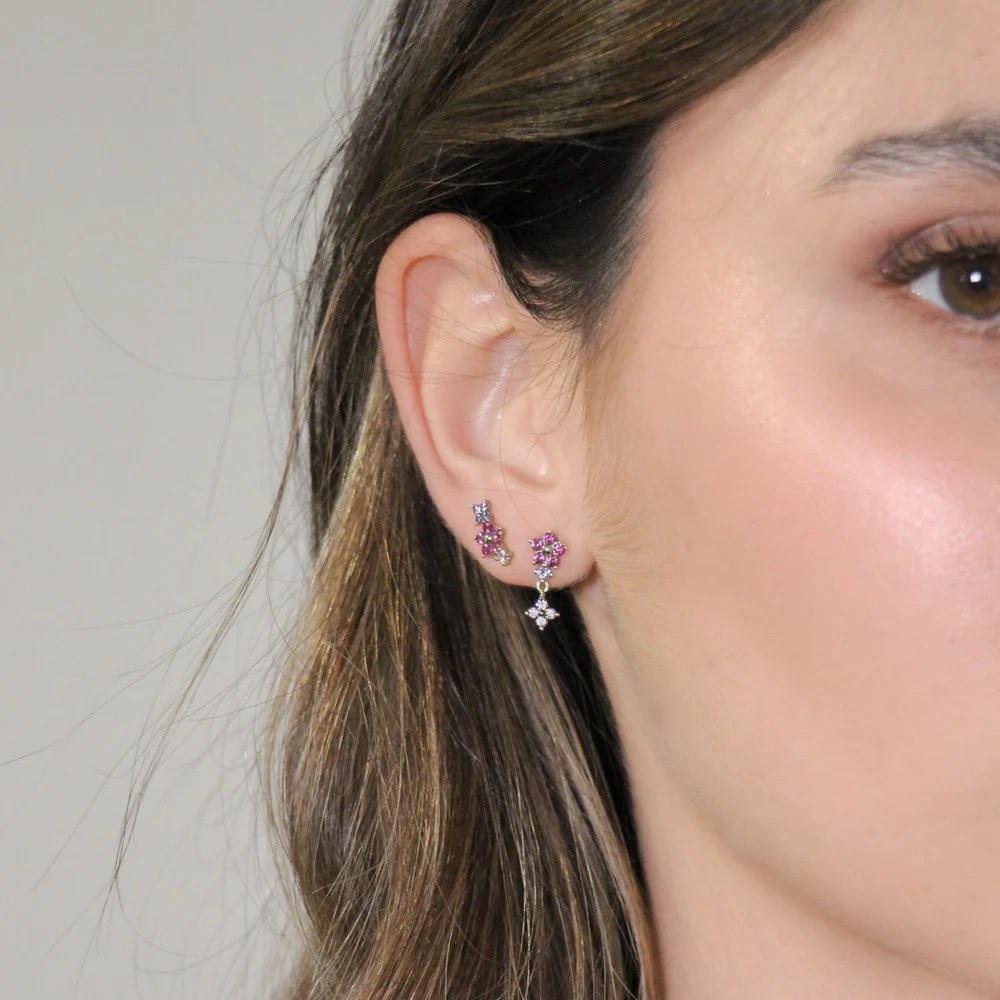 Orecchini donna amen, ORFIMGFU3, collezione fiori, in argento 925 dorato con fiorellini di zirconi multicolor. Il fiore centrale a cinque petali è fucsia, accompagnato da un bocciolo a quattro petali rosa e un punto luce lilla. Altezza totale 1, 2 cm, chiusura a farfallina