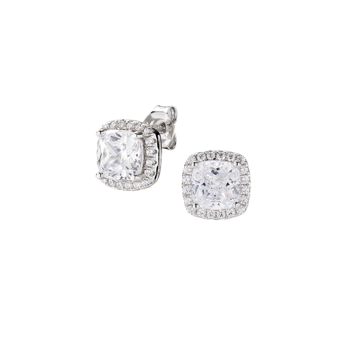 L'orecchino ha altezza totale 8 mm, lo zircone taglio radiant al centro misura 6 x 6 mm, ed è messo in risalto da un bordo di piccoli zirconi bianchi