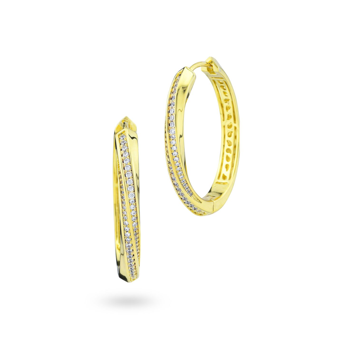 Orecchini donna boccadamo, KOR046D, collezione caleida, in bronzo dorato con zirconi. Misure: cm 3, 5x2, 8 Dimensione: altezza pavè mm 5 Chiusura: a baionetta