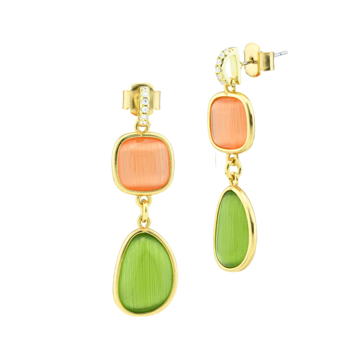 Orecchini donna boccadamo, XOR728DV, collezione crisette, in bronzo placcato oro giallo, con cristalli pendenti di colore orange e verde con contromaglia di zirconi