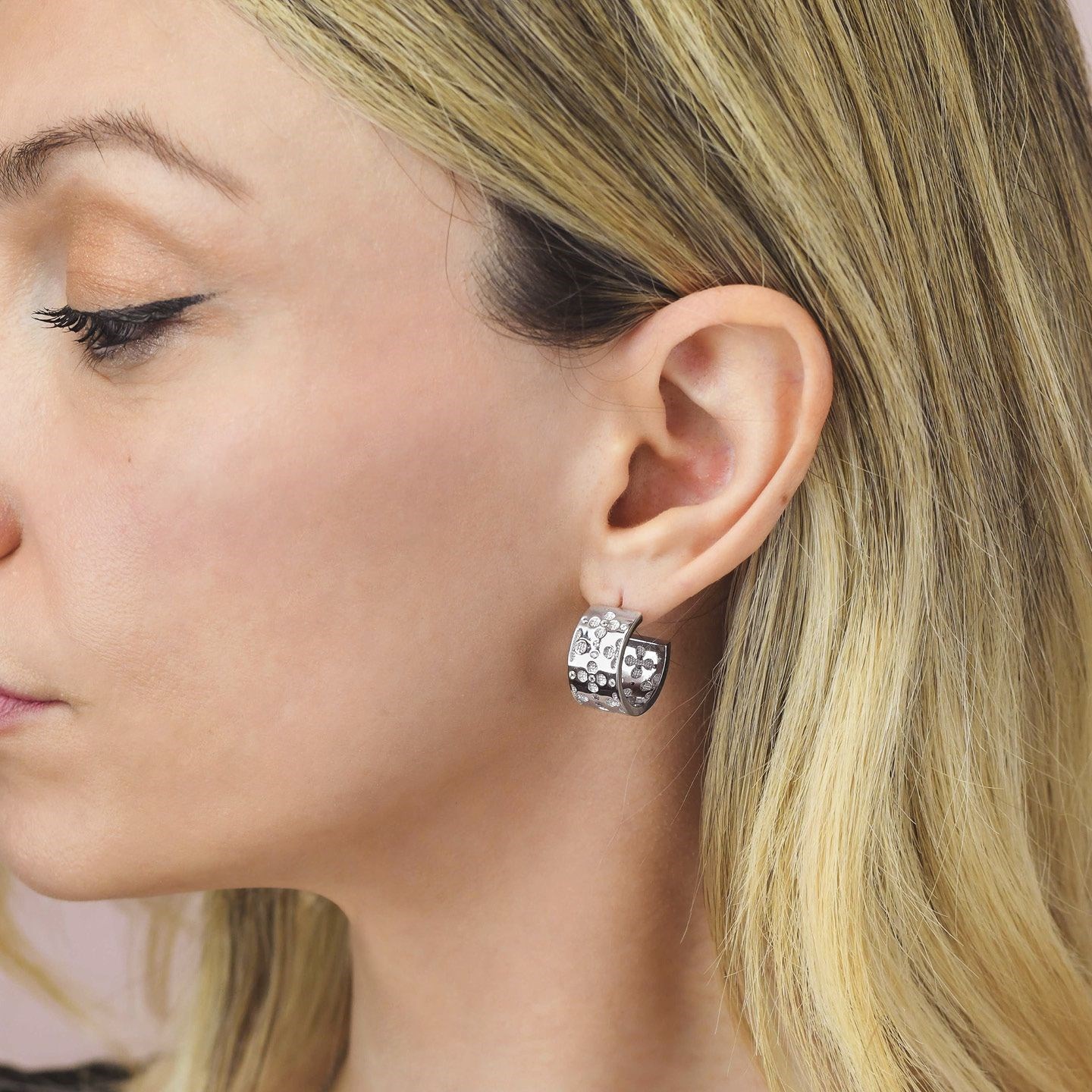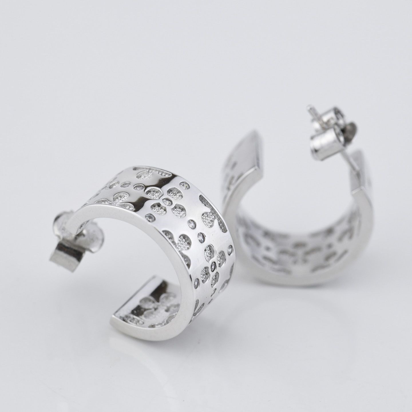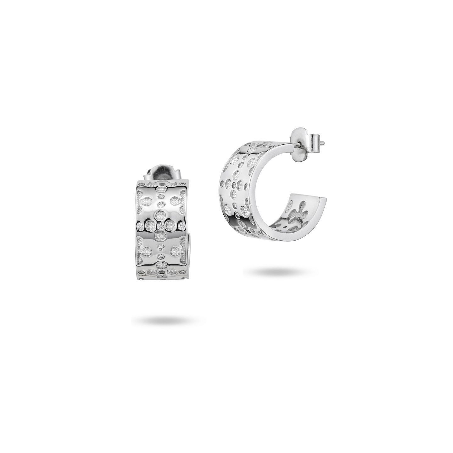 Orecchini donna boccadamo, XOR737, collezione nexma, in bronzo rodiato a semicerchio con motivo floreale inciso e ripetuto lungo tutta la fascia con inserti di zirconi. Dimensione: diametro cm 1, 5; spessore 1 cm Chiusura: con farfalla