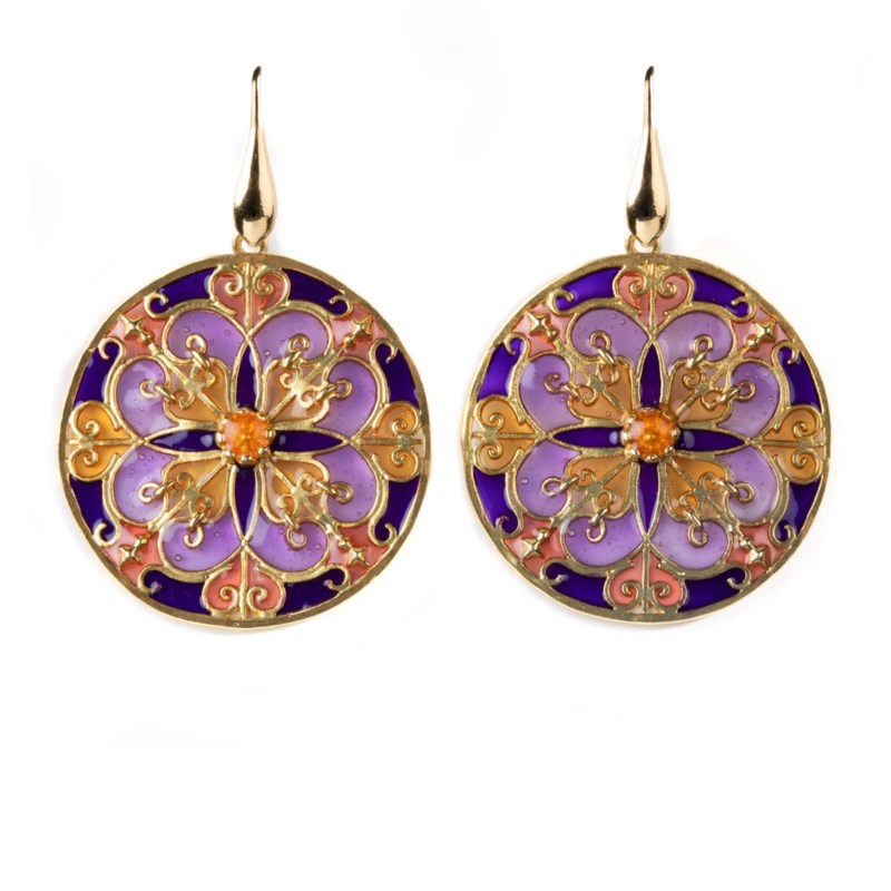 Orecchini donna isola bella, 20000539, collezione balconi di sicilia in argento 925 placcato oro e smalti: I colori del tramonto dietro le vetrate di un palazzo barocco, mentre il sole scende e il cielo si tinge di sfumature di rosa e viola.