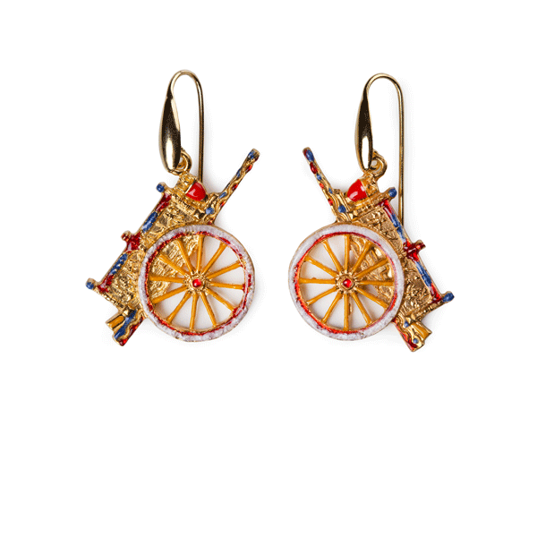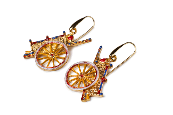 Orecchini in argento 925 placcato oro, smalti.20000062 Il carretto siciliano è stato uno dei principali mezzi di trasporto dell’isola, costruito con diverse qualità di legno e trainato da cavalli. Simbolo dell’iconografia folkloristica siciliana, è famoso per le decorazioni pittoriche dai colori sgargianti.