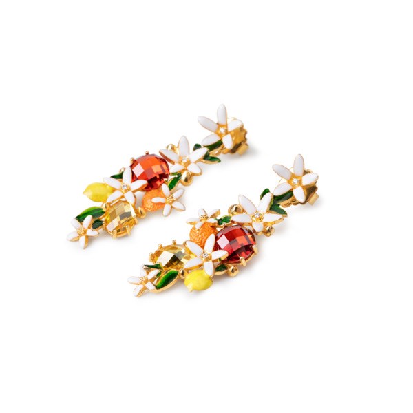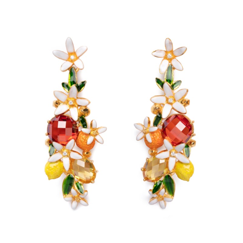 Orecchini donna isola bella, 20001005, collezione orecchini, in argento 925 placcato oro con smalto e zirconi. Sono rami di alberi di arance e limoni che si stagliano verso il cielo, basta avvicinarsi per essere conquistati dal profumo: una coppia di orecchini ispirati alla campagna siciliana, in cui il colore dei frutti si mescola alla delicata fragranza dei fiori di zagara.