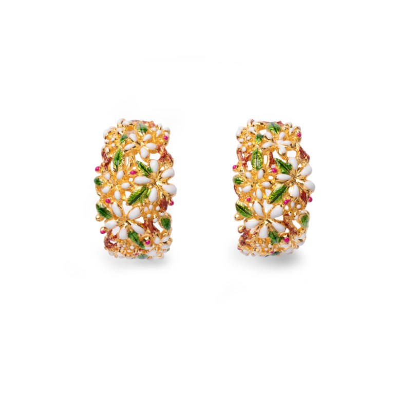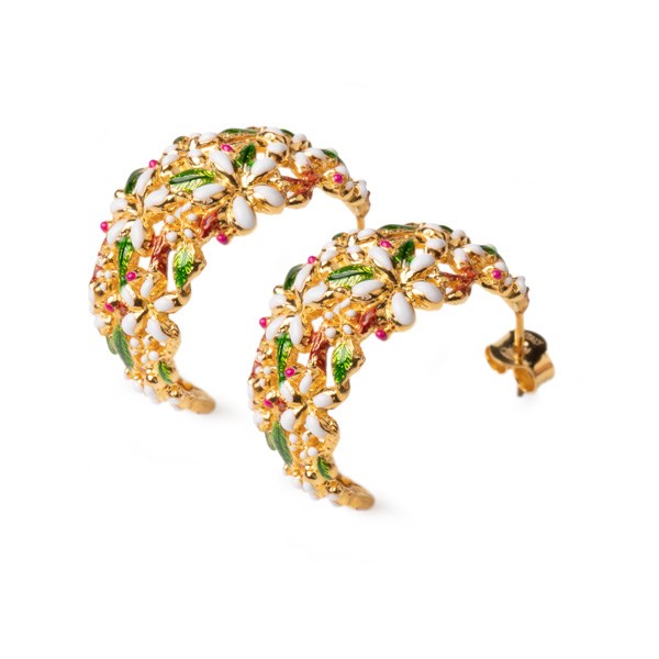 Orecchini donna isola bella, 20001028, collezione orecchini, in argento 925 placcato oro con smalti. La pianta del gelsomino arriva dal Medio Oriente e, secondo la leggenda, in Italia arrivò grazie a Cosimo de’ Medici che volle la pianta nel suo maestoso giardino.