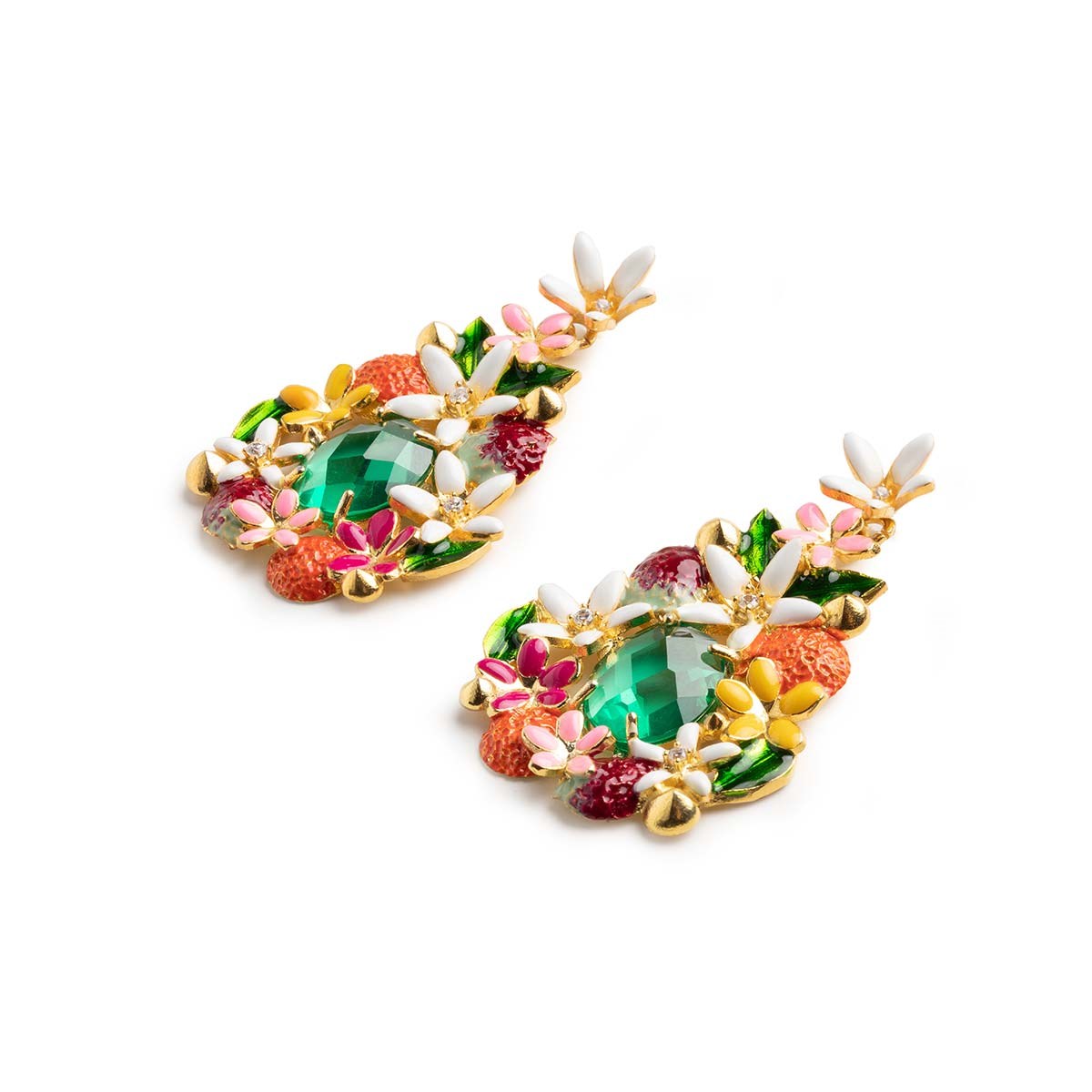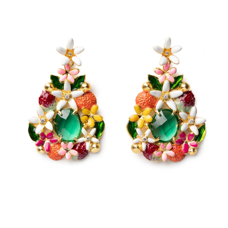 A differenza della maggior parte delle pietre sintetiche, presenta caratteristiche tecniche uniche, fra cui una eccezionale resistenza a temperature elevatissime e la possibilità di essere presente in oltre 500 colorazioni differenti e in un numero svariato di tagli. Un tripudio di fiori, foglie e agrumi avvolge il prezioso cuore verde che è un inno all’elemento Terra. Tutta la maestria dei nostri artigiani risplende attraverso questi pendenti, ideati e realizzati per chi non vuole di certo passare inosservato.