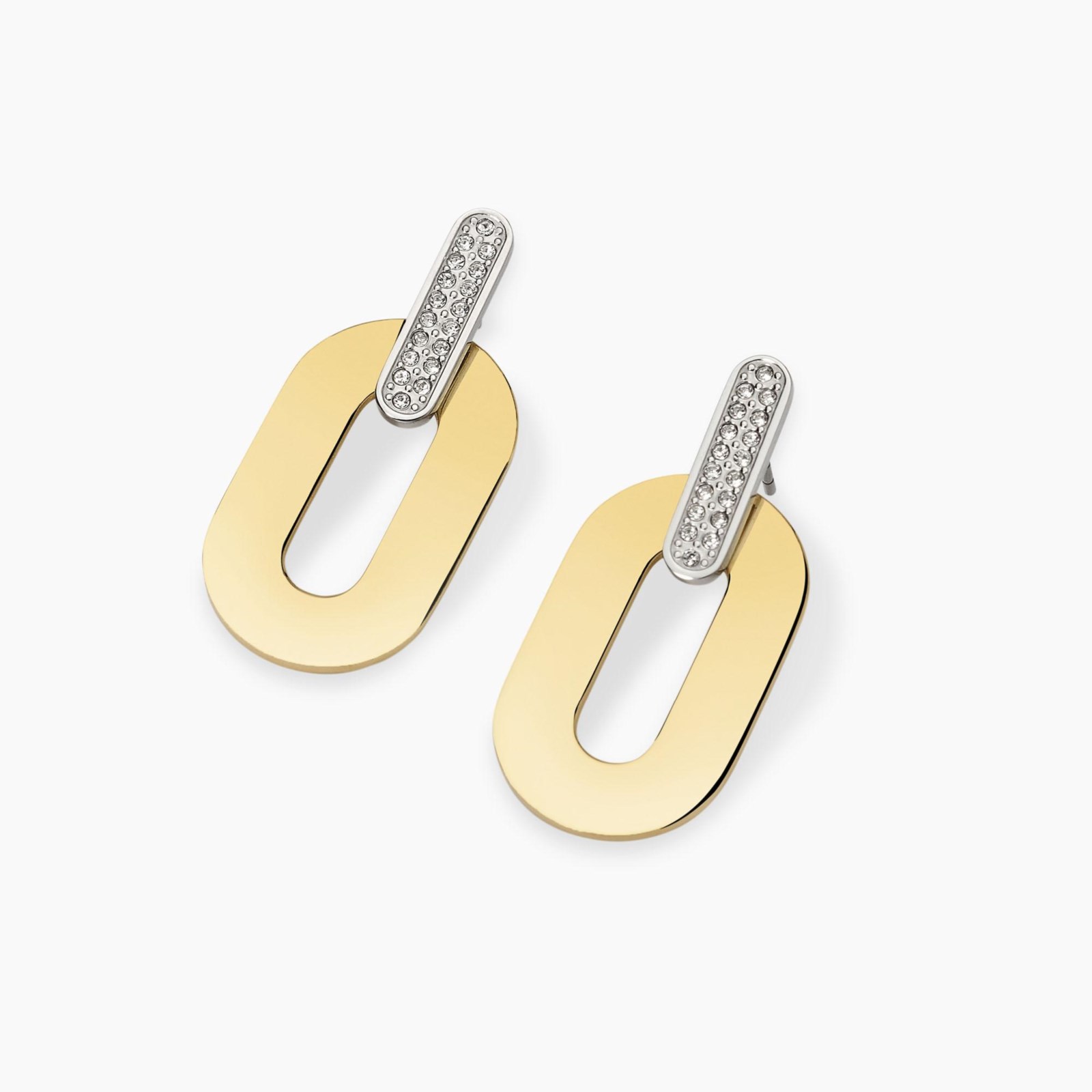 Orecchini donna kidultt, 861060, collezione style, in acciaio dorato con cristalli bianchi e pendenti allungati. • Dimensione elemento superiore: 4x15 mm • Dimensione pendente: 15x25 mm • Diametro cristalli: 1, 25 mm • Lunghezza totale dell'orecchino: 3, 2 cm