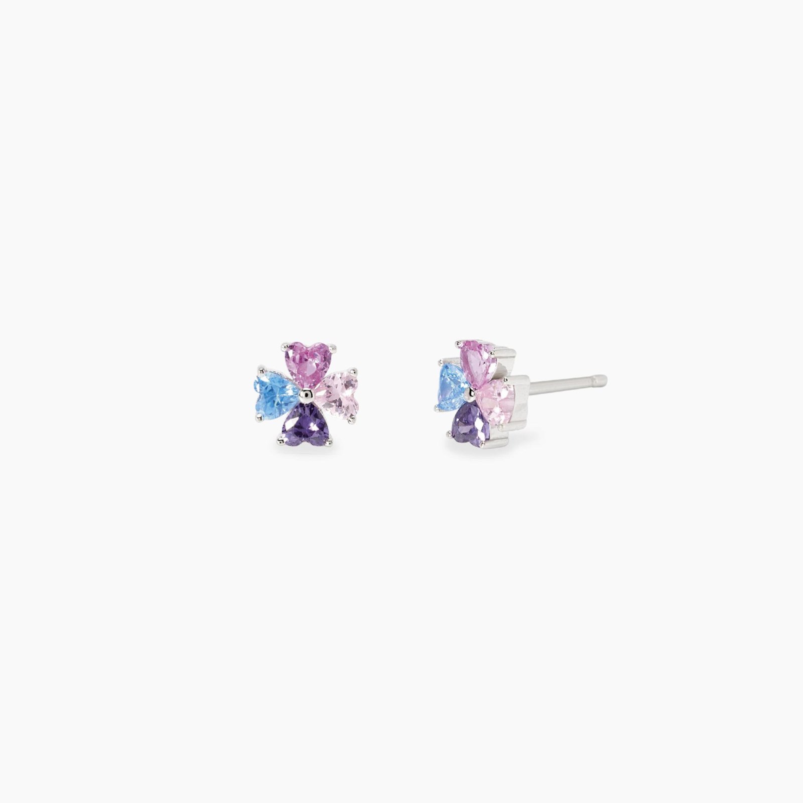 Orecchini bimba mabina, 563959, collezione argento junior, in argento rodiato con quadrifoglio in tormaline rosa sintetiche e zirconi multicolor taglio cuore.