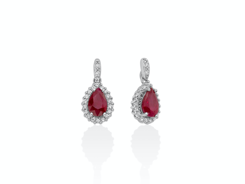 Orecchini donna miluna, Erd2625, collezione gemme preziose. Oro 750/1000 Nr 40 Diamanti naturali Pt.tot 20 Col.G Pur.SI Taglio Brillante Rotondo Nr 2 Rubino naturale Goccia mm 6x4 Ct 0, 92