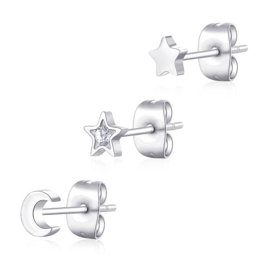 Tris orecchini donna s'agapò, Sck160, collezione click, in acciaio a forma di mezzaluna, stella e stella con cristallo
