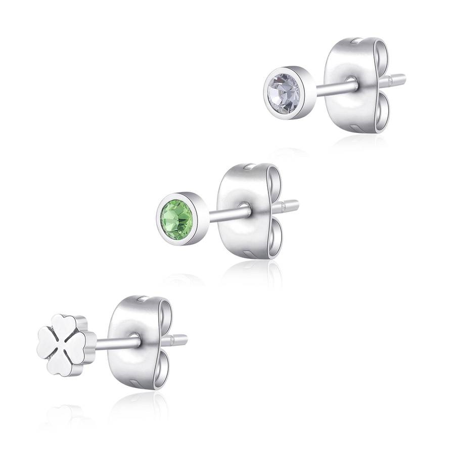 Tris orecchini donna s'agapò, Sck162, collezione click, in acciaio a forma di quadrifoglio e cristalli