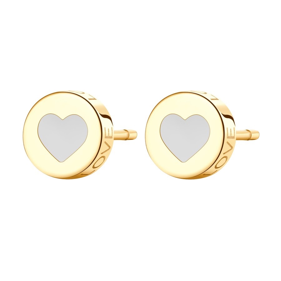 Orecchini donna s'agapò, Sck53, collezione click, in acciaio dorato con cuori smaltati e scritta:'Love'