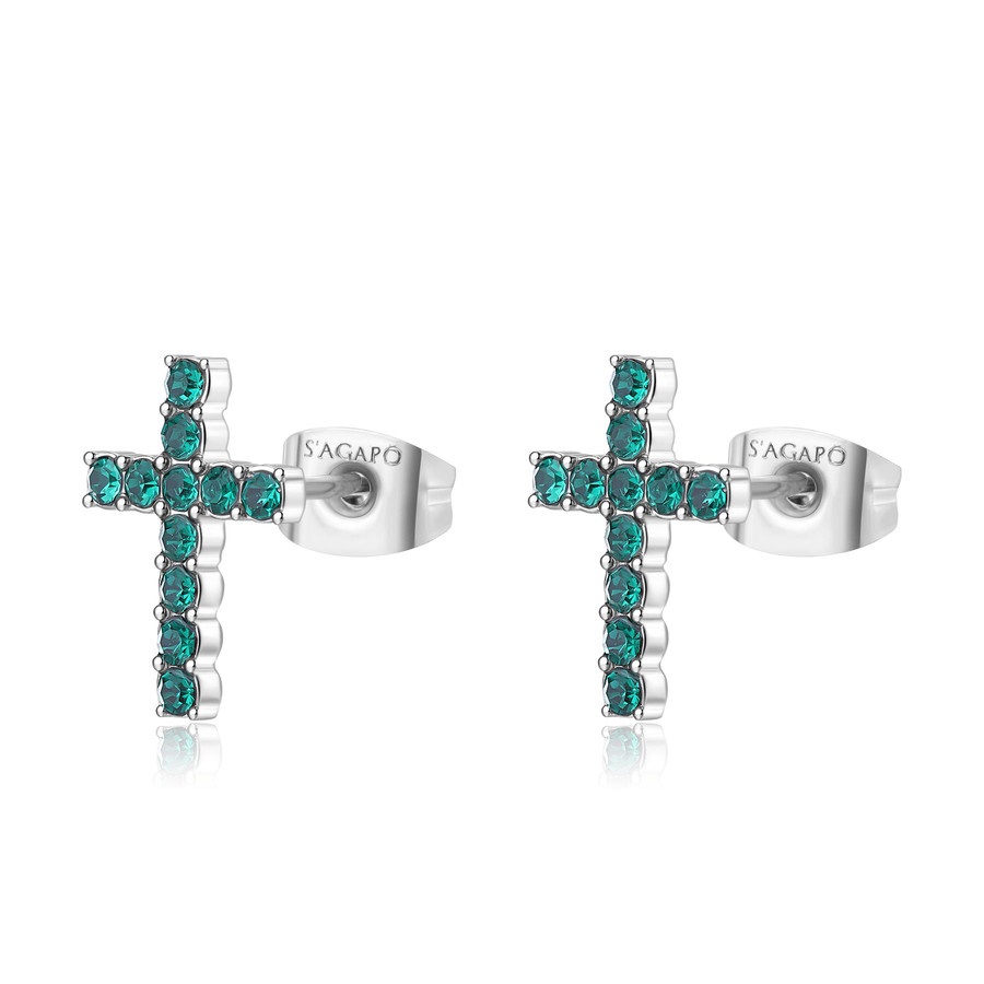 Orecchini donna sagapò, SDZ115, collezione dazzly, in acciaio 316L a forma di croce con cristalli colore emerald. Misura orecchini:12mm