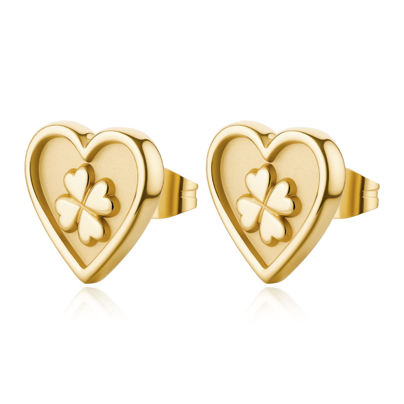 Orecchini donna saapò, SUH33, collezione duh duh, a forma di cuore in acciaio 316L satinato, finitura pvd oro 14K con quadrifoglio.