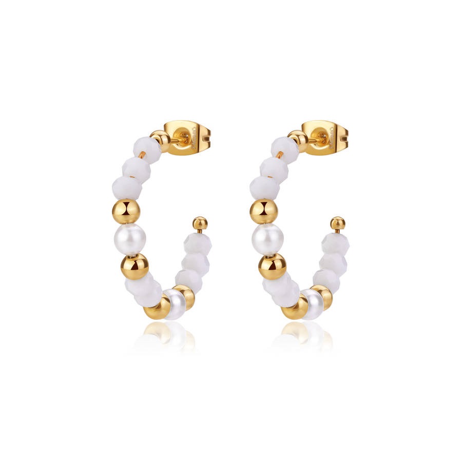 Orecchini donna s'agapo, SGI25, collezione glint, in acciaio 316L e finitura in pvd oro 14K con sfere in vetro bianco, acciaio 316L e perle, misura 22mm