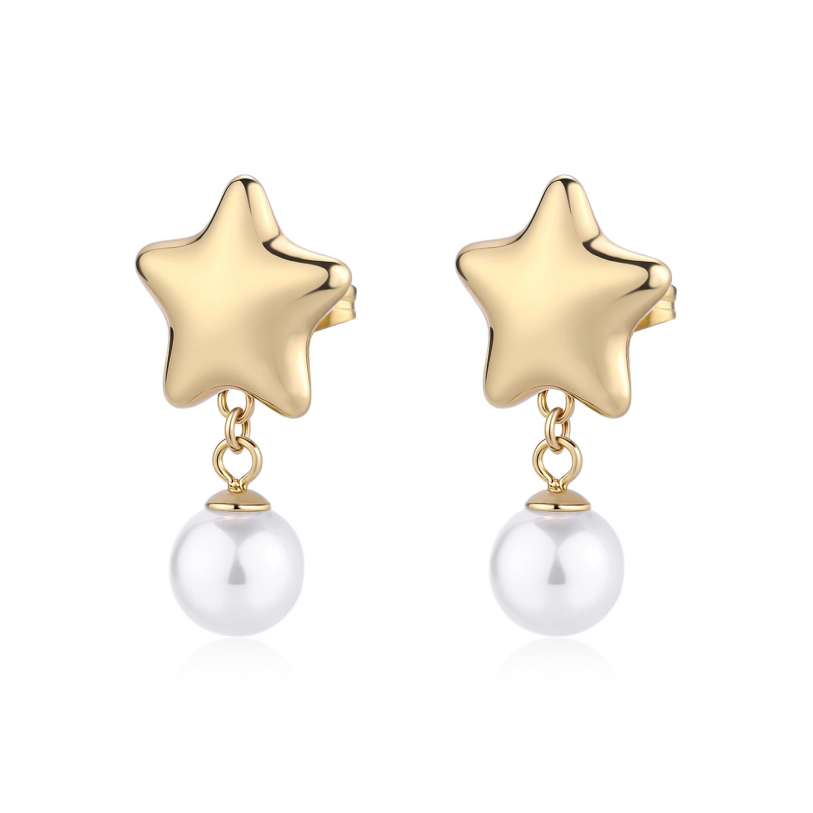 Orecchini donna sagapò, SSE50, collezione stellar, in acciaio 316L e finitura dorata a forma di stella con perle di conchiglia. dimensioni 30mm.