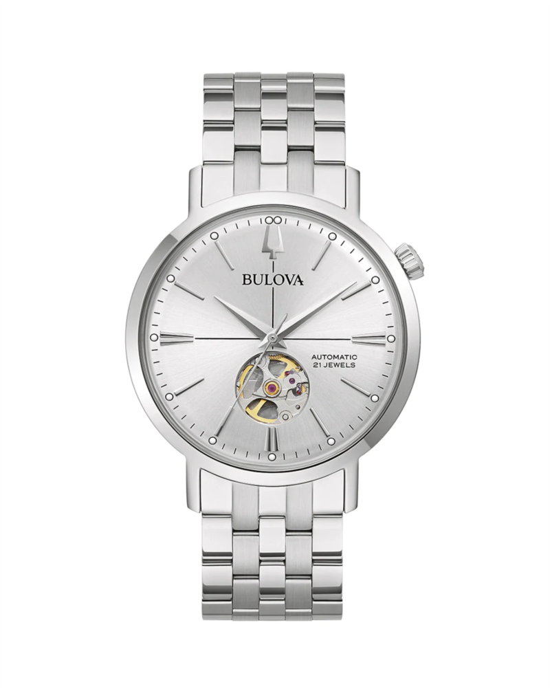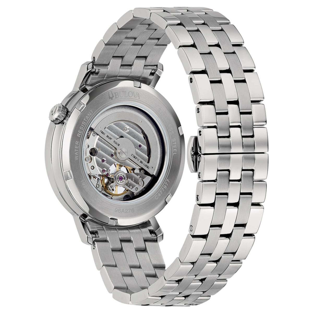 Orologio uomo bulova, 96A276, collezione aerojet, movimento automatico, solo tempo, cassa in acciaio 41mm, quadrante silver con movimento a vista, bracciale in acciaio, resistenza all'acqua 3atm