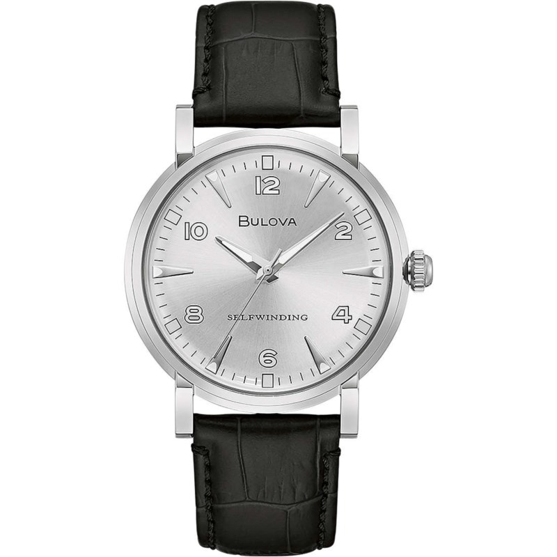 Orologio uomo bulova, 96a244, collezione clipper, movimento automatico, solo tempo, cassa in acciaio 39mm, quadrante silver con datario, cinturino in pelle nera, resistenza all'acqua 3atm