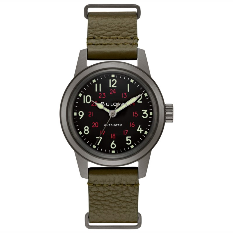 Orologio uomo bulova, 98a255, collezione military, movimento automatico, solo tempo, cassa in acciaio 38mm, quadrante nero, cinturino in pelle verde, resistenza all'acqua 3atm