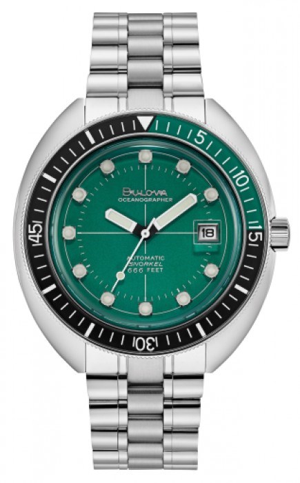 Orologio uomo bulova, 96b322, collezione Oceangrapher, ; movimento automatico, solo tempo, datario, cassa acciaio 44 mm, quadrante verde, vetro zaffiro antiriflesso, bracciale acciaio, resistenza acqua 200mt