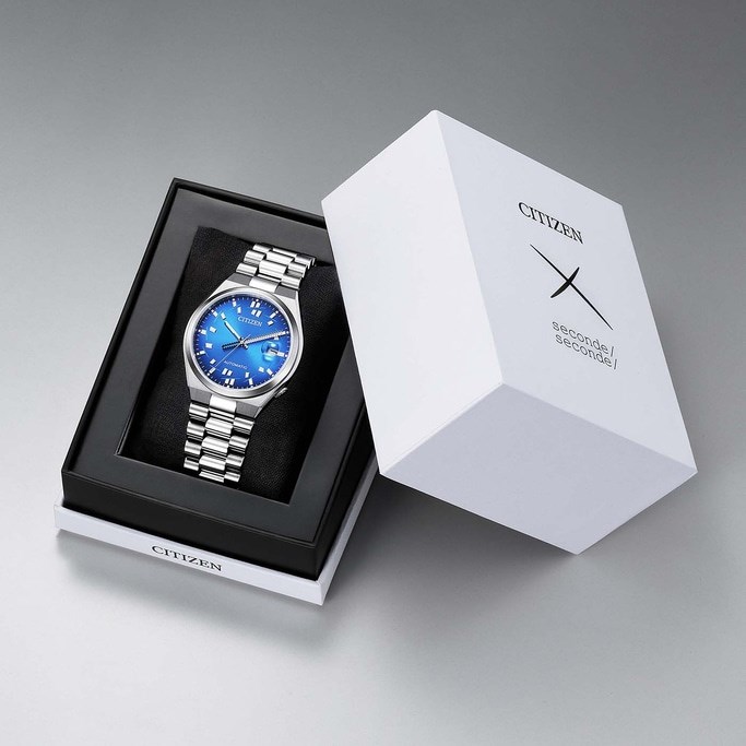 Orologio uomo citizen, NJ0157-81L, collezione tsuyosa, movimento automatico, solo tempo, cassa in acciaio 40mm, quadrante blu con datario a bolla, vetro minerale, fondello oblò trasparente con movimento a vista, bracciale in acciaio, resistenza all'acqua 5atm