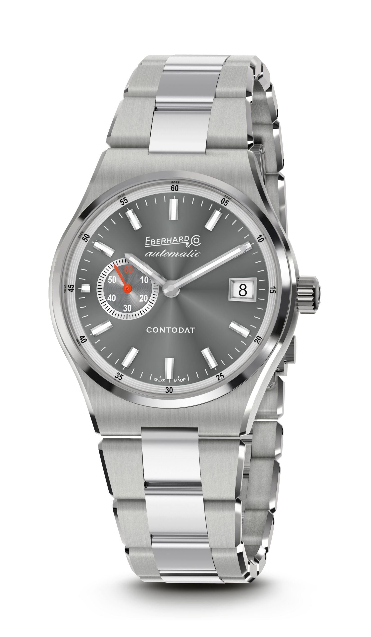 Orologio uomo eberhard, 41156.04 CA, collezione contodat, movimento automatico, solo tempo, cassa in acciaio 39mm, quadrante silver con datario, bracciale in acciaio, resistenza all'acqua 100m VETRO ZAFFIRO SCAVATO E CONVESSO CON TRATTAMENTO ANTIRIFLESSO SULLA SUPERIFICIE INTERNA, CORONA A VITE IN ACCIAIO, IMPREMEABILE, PERSONALIZZATA, FONDO IN ACCIAIO SERRRATO A VITE, FINITURA CENTRALE SATINATA E LUCIDA SULLA CIRCONFERENZA, PERSONALIZZATO CON L’INCISIONE DORATA IN LATINO «UBI TU IBI EGO», QUADRANTE GRIGIO CON FINITURA “SOLEIL”.