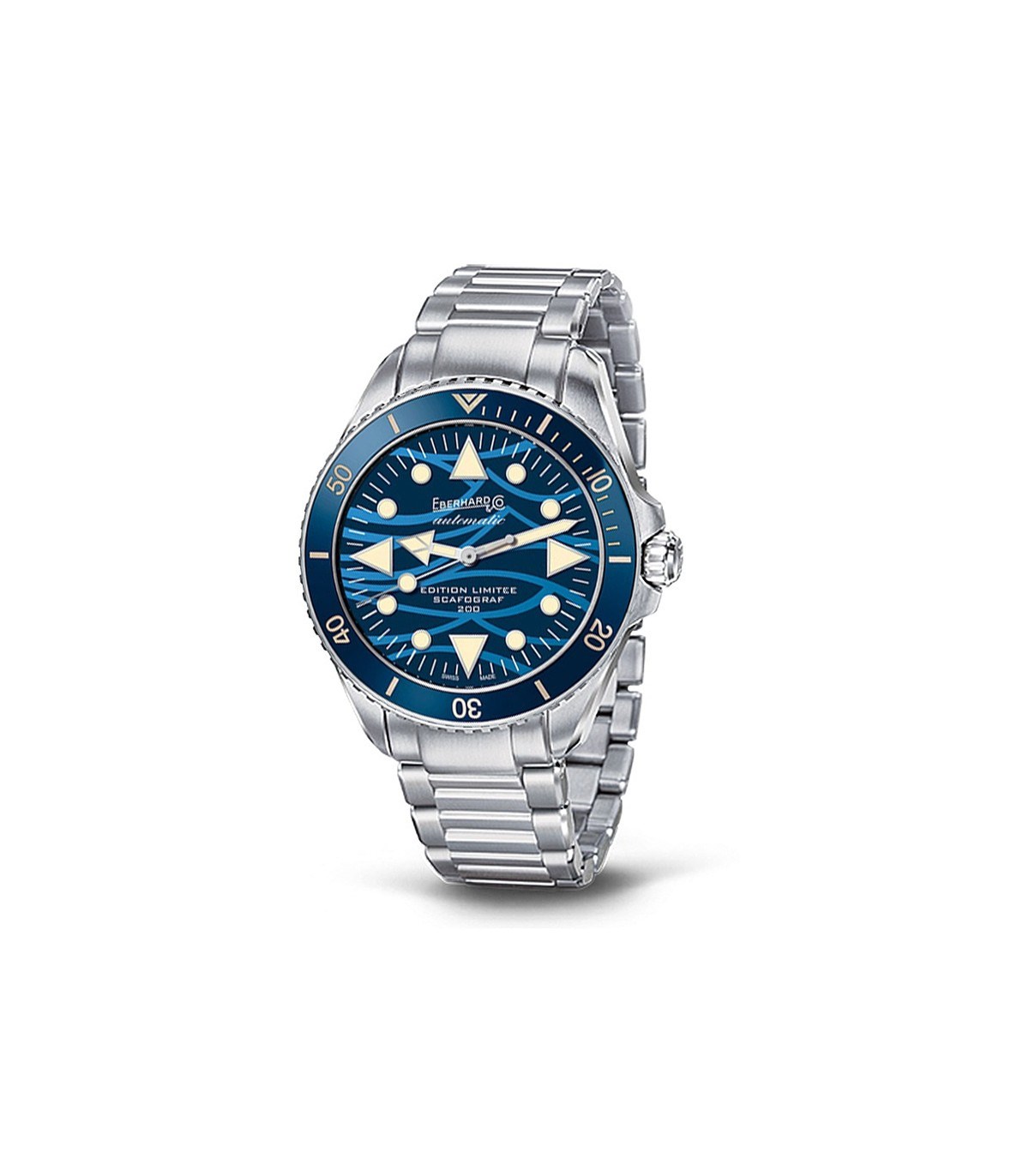 Orologio uomo Eberhard, 41046 CA2C.1 , collezione Scafograf, movimento meccanico automatico, solo tempo, cassa in acciaio 43mm, quadrante azzurro con motivo a onde, vetro zaffiro bombato antigraffio e antiriflesso, cinturino in acciaio, nella scatola è presente un secondo cinturino in caucciù blu, resistente all'acqua fino a 200mt.