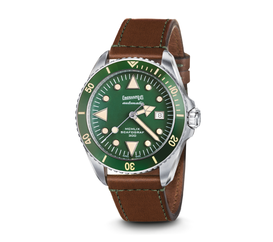 Orologio uomo eberhard, 41034VS CP.9, collezione scafograf 300, movimento meccanico automatico, solo tempo, quadrante verde con datario, vetro zaffiro antiriflesso, cinturino in pelle marrone, resistenza all'acqua 30atm