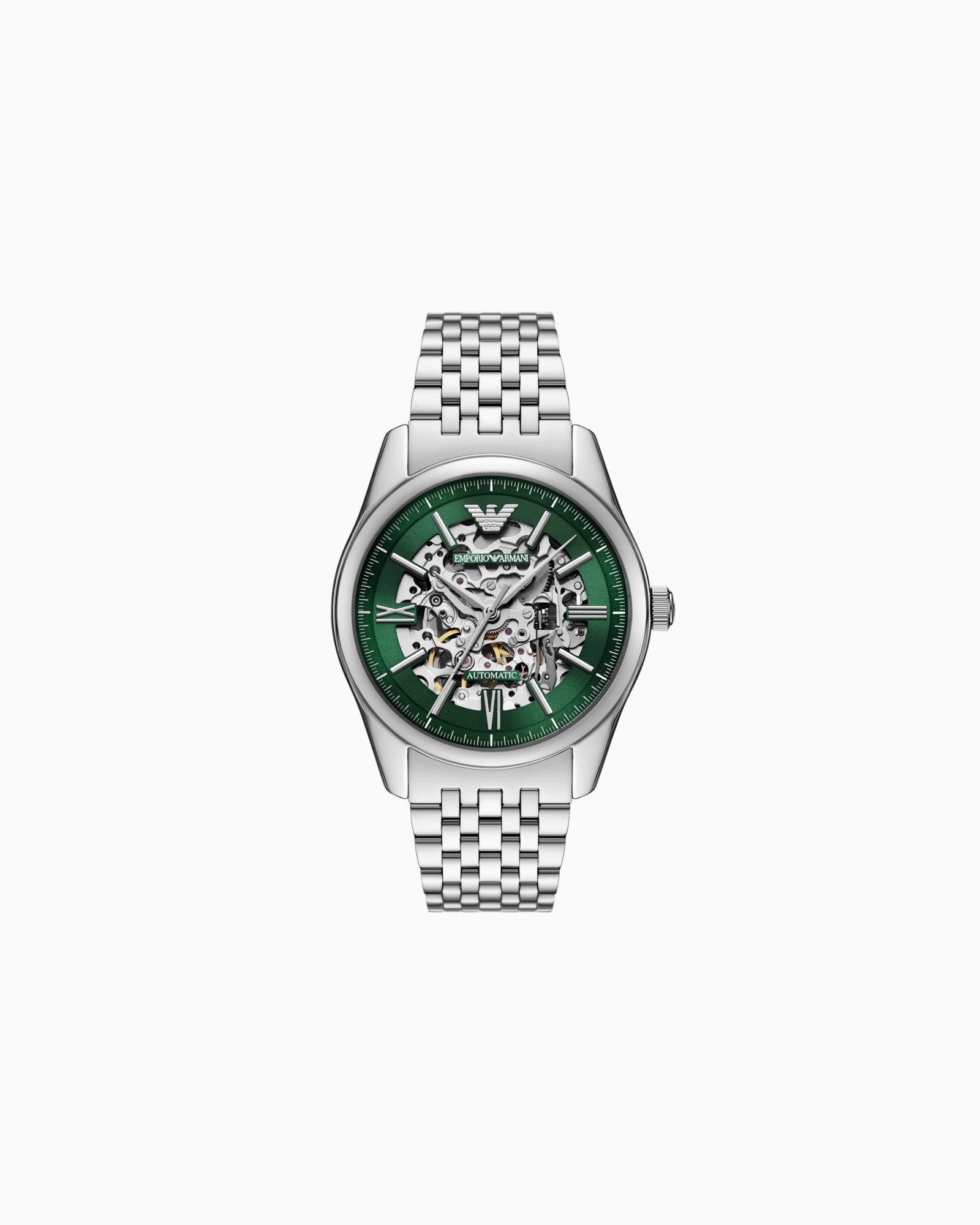 Orologio uomo emporio armani, AR60091, collezione antonio, movimento automatico, solo tempo, cassa in acciaio 43mm, quadrante verde scheletrato con movimento a vista, bracciale in acciaio, resistenza all'acqua 5atm