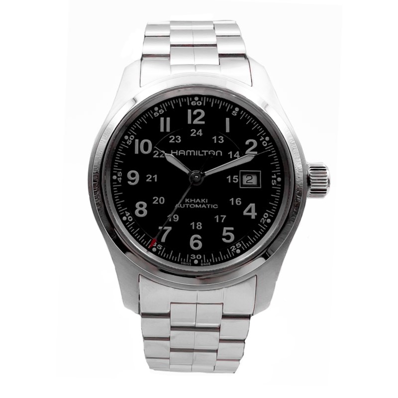 Orologio uomo hamilton, H70515137, collezione Khaki Field, movimento automatico, solo tempo, cassa in acciaio 42mm, quadrante nero con datario, bracciale in acciaio, resistenza all'acqua 10atm