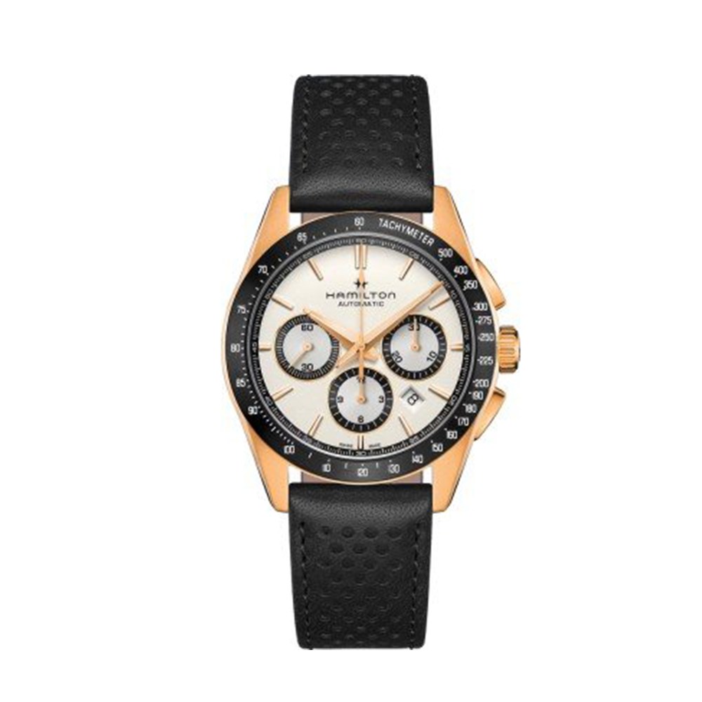 Orologio uomo hamilton, H36626710, collezione Jazzmaster, movimento automatico, funzione cronografo, data, tachimetro, cassa in acciao 42mm, quadrante bianco con vetro zaffiro, cinturino in pelle di vitello larghezza 20mm, resistenza all'acqua 10atm