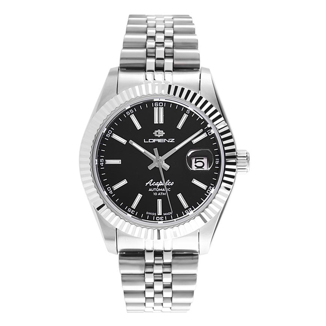 Orologio uomo lorenz, 090017BB, collezione acapulco, movimento automatico, solo tempo, cassa in acciaio 39mm, quadrante nero con datario a bolla, bracciale in acciaio, resistenza all'acqua 10atm