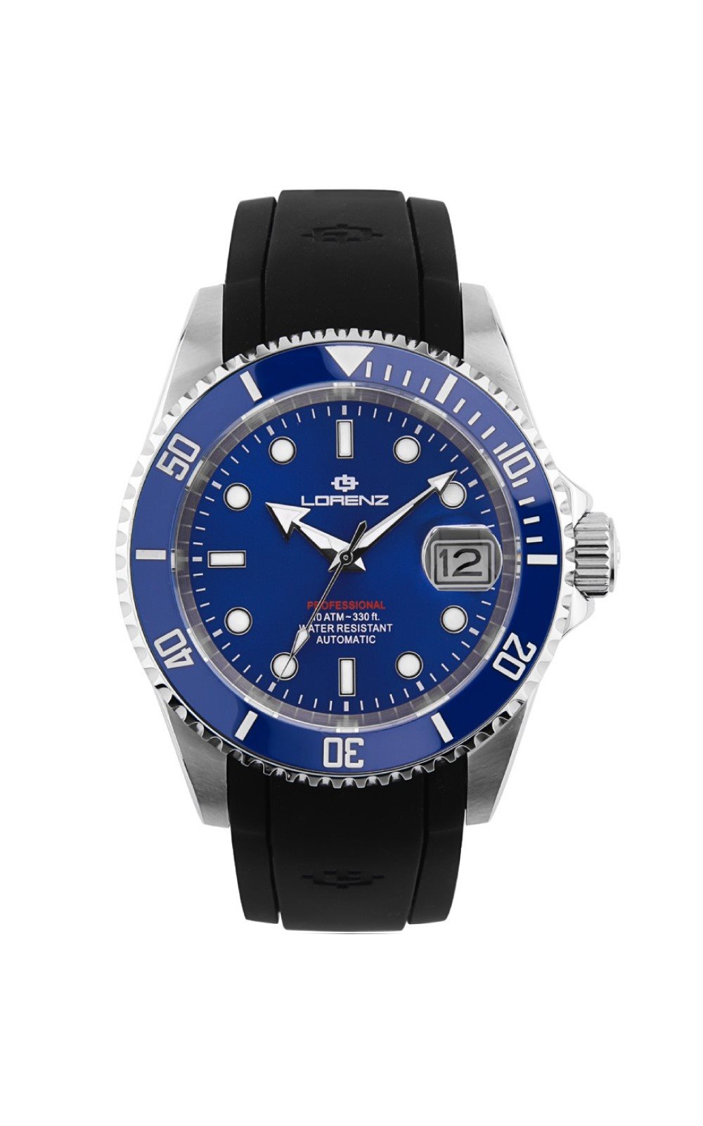 Orologio uomo lorenz, 030197FF, collezione classic professional, movimento automatico, solo tempo, cassa in acciaio 42mm, quadrante nero con datario a bolla, cinturino in resina doppia iniezione, resistenza all'acqua 10atm