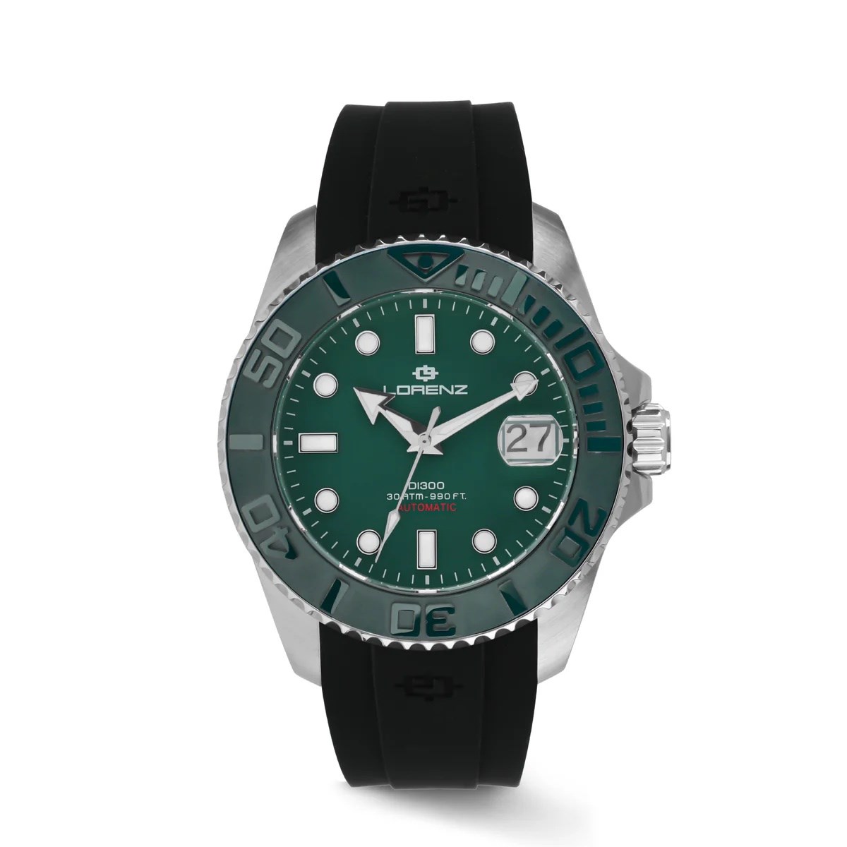 Orologio uomo lorenz, 030258CC, collezione di300, movimento automatico, solo tempo, cassa in acciaio 42mm, quadrante verde con datario a bolla, cinturino in gomma, resistenza all'acqua 30atm