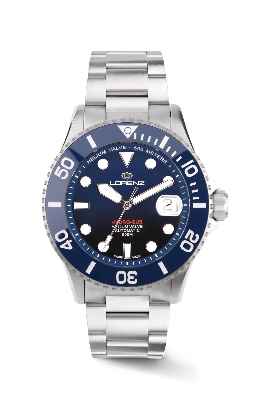 Box orologio uomo lorenz, 090011BB, collezione hydro-sub, movimento automatico, solo tempo, cassa in acciaio 43mm, quadrante blu con datario a bolla, Lunetta girevole unidirezionale in ceramica solida con scala dei tempi di immersione e pallino in luminova a ore 12, valvola per la fuoriuscita dell’elio a ore 9, bracciale in acciaio, resistenza all'acqua 50atm cinturino addizionale
