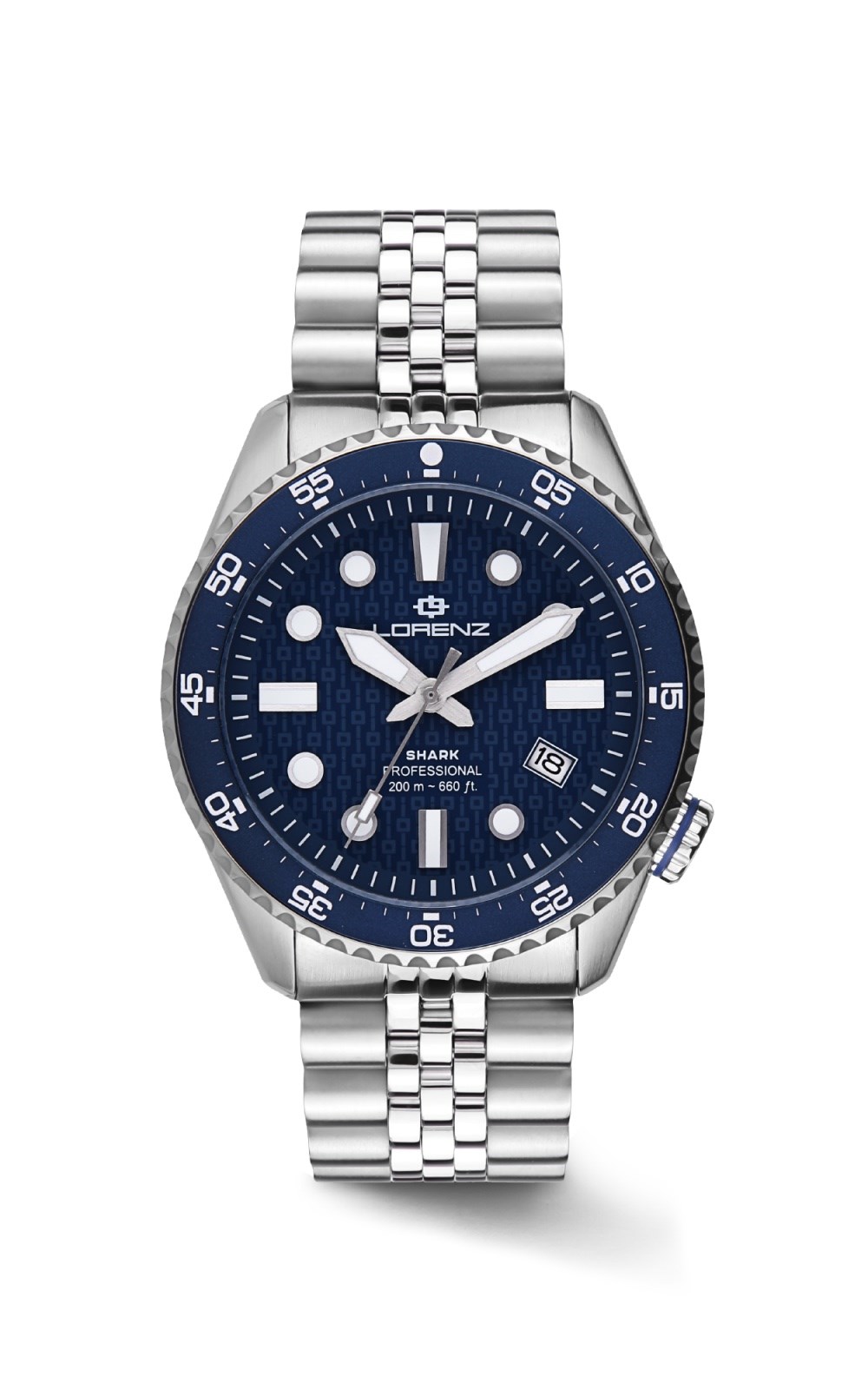 Orologio uomo lorenz, 030255BB, collezione shark 5, movimento automatico, solo tempo, cassa in acciaio 42mm, quadrante blu con datario, corona a ore 4, 5 versioni, Corona e fondo a vite, Vetro zaffiro, bracciale in acciaio, resistenza all'acqua 20atm cinturino addizionale in gomma nero