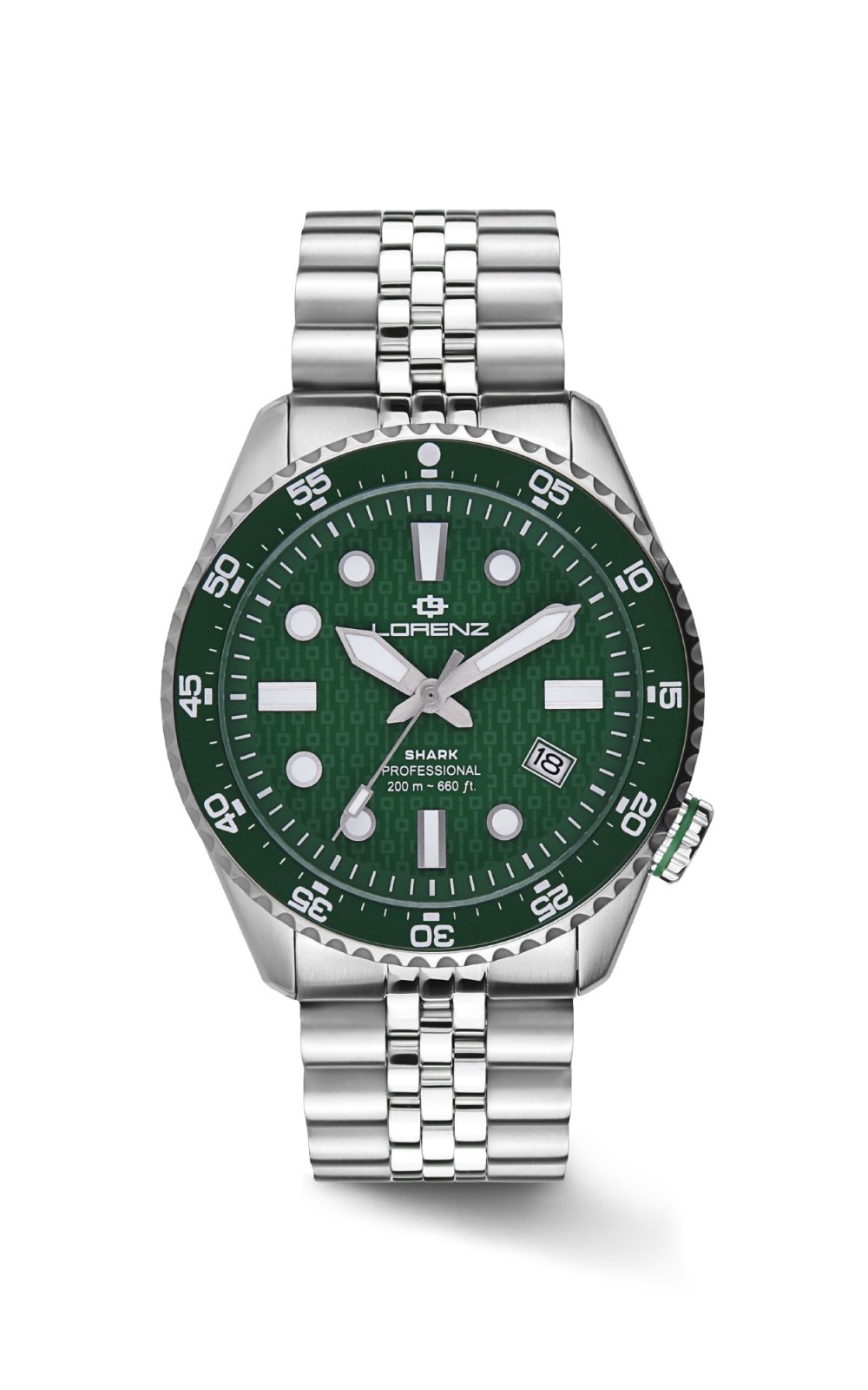 Orologio uomo lorenz, 030255CC, collezione shark 5, movimento automatico, solo tempo, cassa in acciaio 42mm, quadrante verde con datario, corona a ore 4, 5 versioni, Corona e fondo a vite, Vetro zaffiro, bracciale in acciaio, resistenza all'acqua 20atm cinturino addizionale in gomma nero