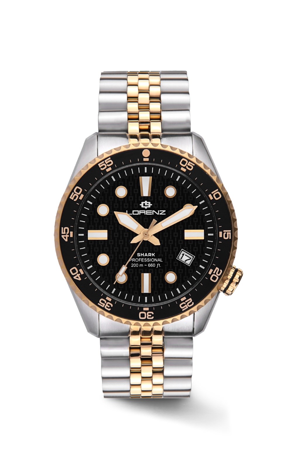 Orologio uomo lorenz, 030255DD, collezione shark 5, movimento automatico, solo tempo, cassa in acciaio 42mm, quadrante nero con datario, corona a ore 4, 5 versioni, Corona e fondo a vite, Vetro zaffiro, bracciale in acciaio, resistenza all'acqua 20atm cinturino addizionale in gomma nero