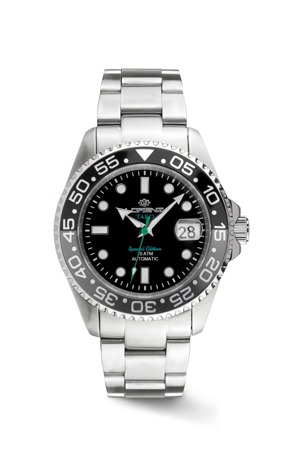 Orologio uomo lorenz, 030254HH, collezione tako, movimento automatico, solo tempo, cassa in acciaio 43mm, quadrante nero con datario a bolla, Lunetta girevole unidirezionale in ceramica, Corona e fondo a vite, Vetro zaffiro con lente, bracciale in acciaio, resistenza all'acqua 10atm