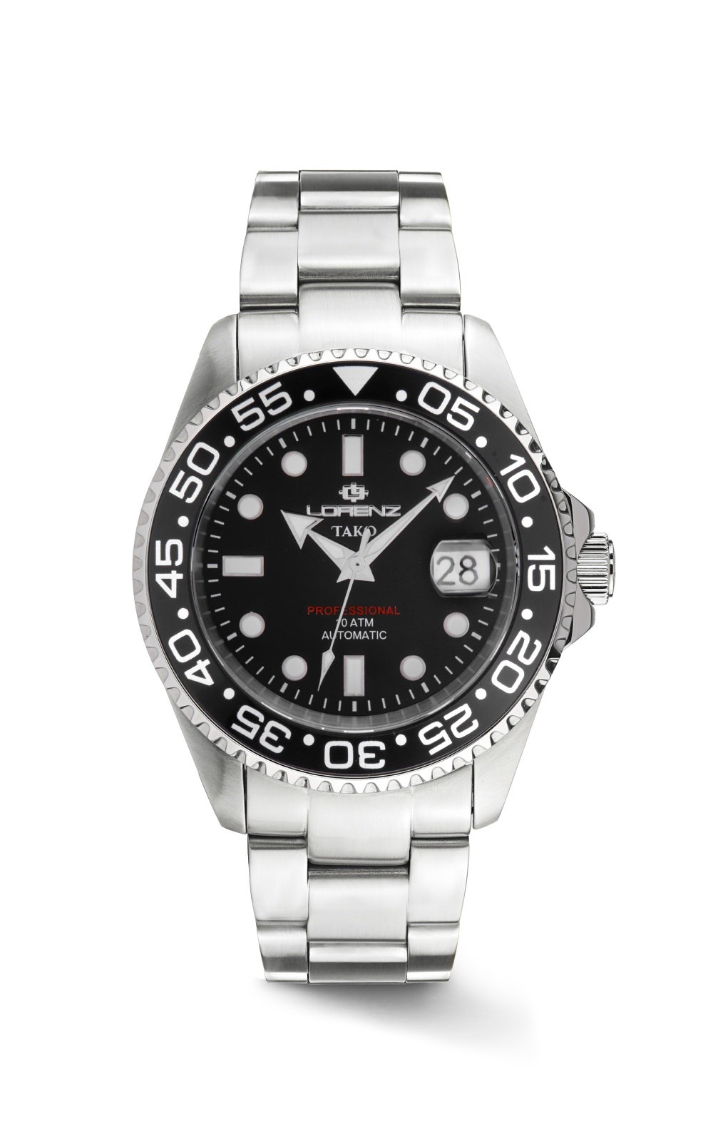 Orologio uomo lorenz, 030254LL, collezione tako, movimento automatico, solo tempo, cassa in acciaio 43mm, quadrante nero con datario a bolla, Lunetta girevole unidirezionale in ceramica, Corona e fondo a vite, Vetro zaffiro con lente, bracciale in acciaio, resistenza all'acqua 10atm