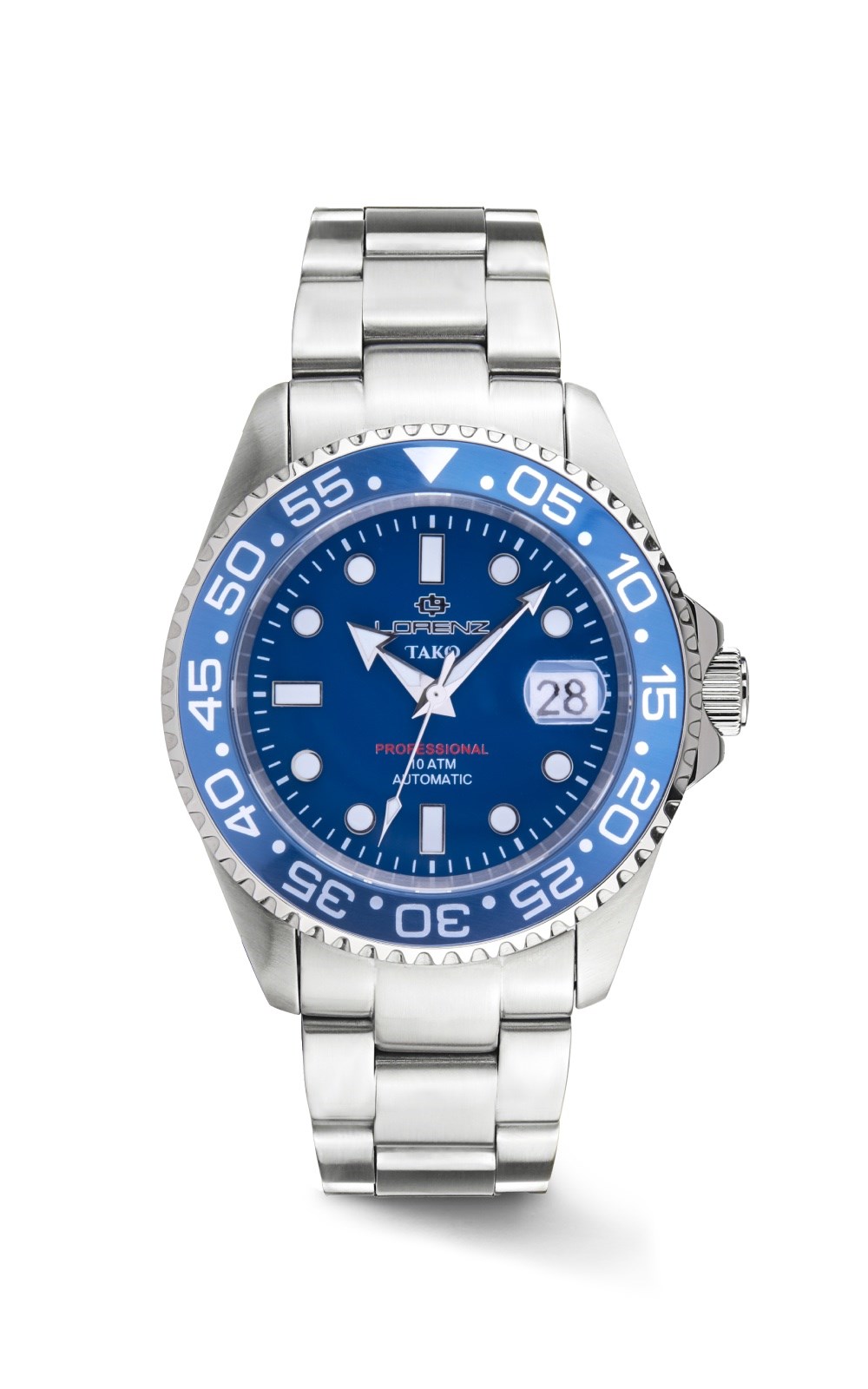 Orologio uomo lorenz, 030254MM, collezione tako, movimento automatico, solo tempo, cassa in acciaio 43mm, quadrante blu con datario a bolla, Lunetta girevole unidirezionale in ceramica, Corona e fondo a vite, Vetro zaffiro con lente, bracciale in acciaio, resistenza all'acqua 10atm