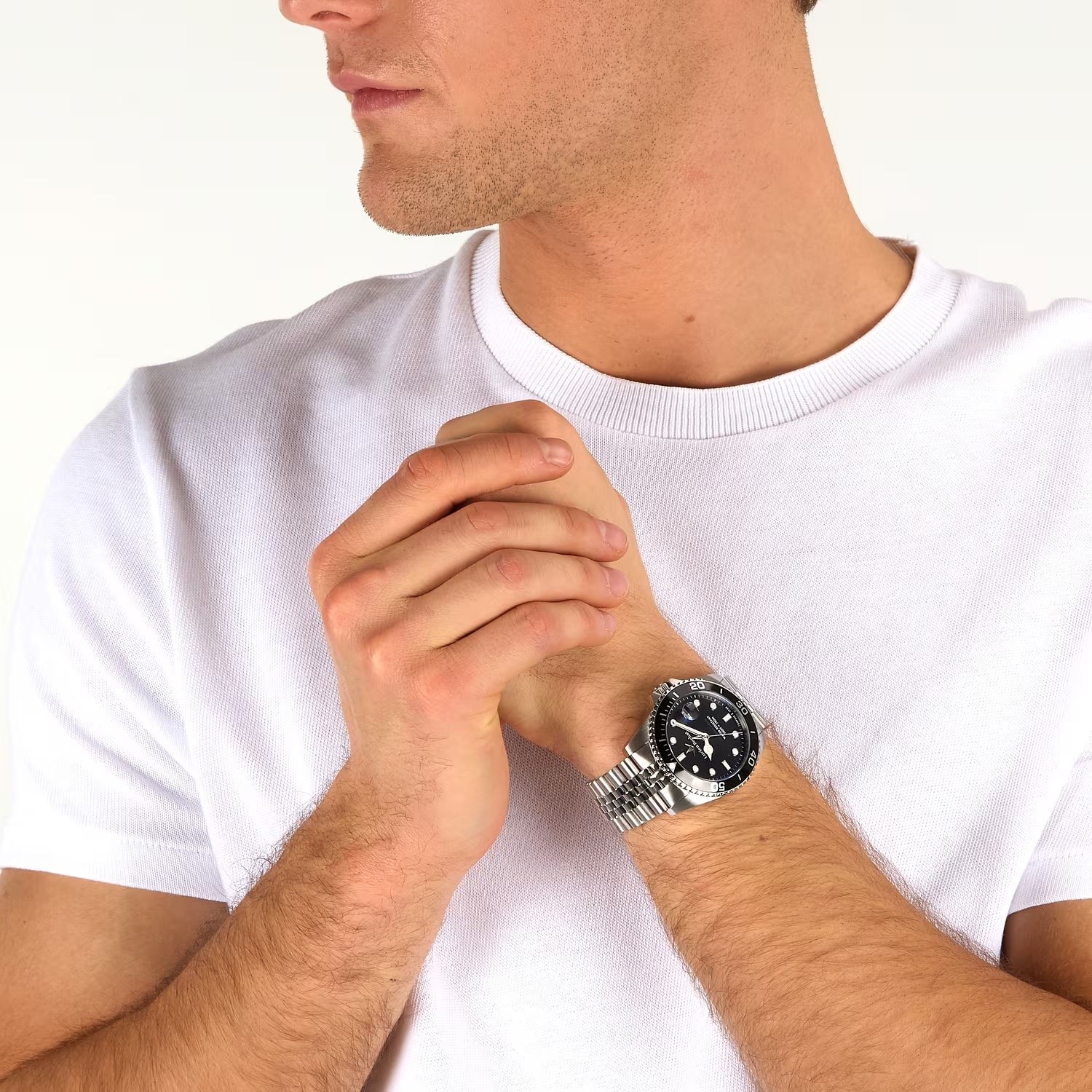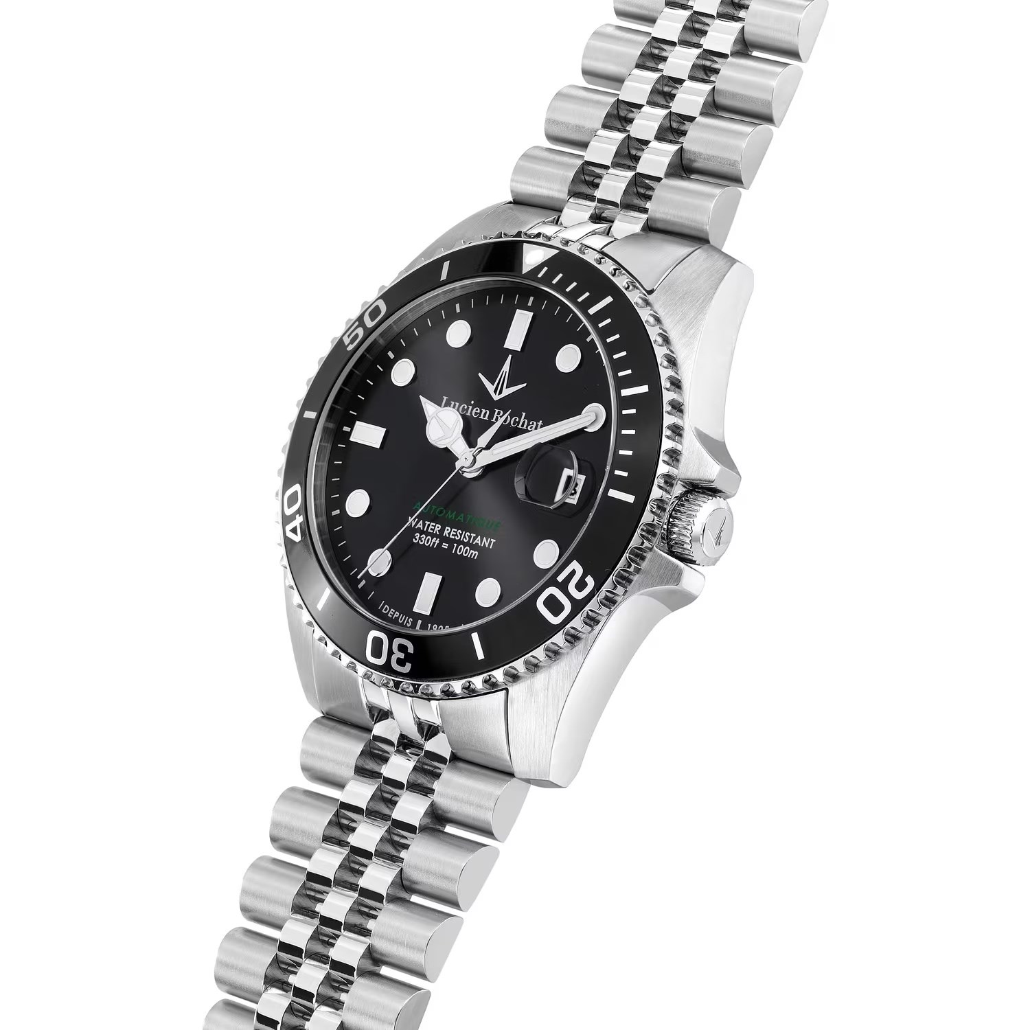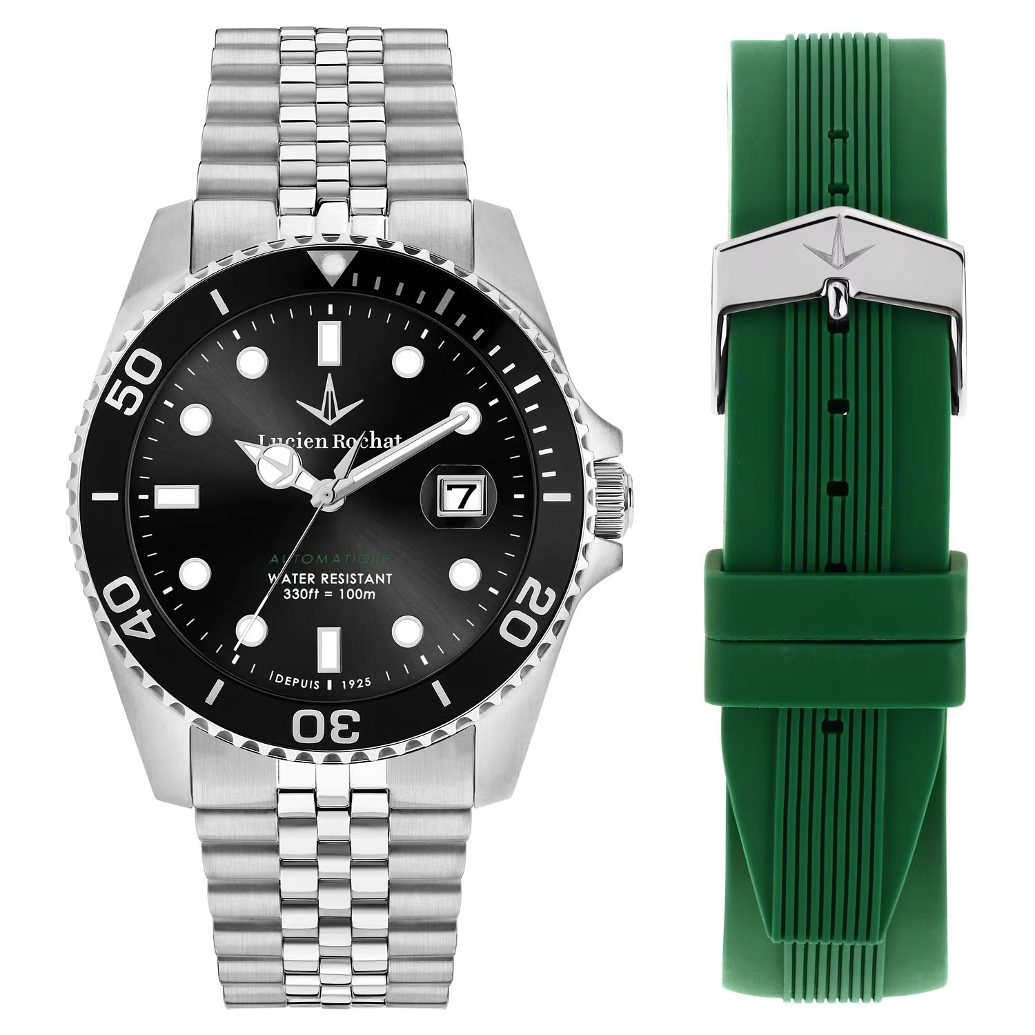 Box uomo lucien rochat, R0423117005, collezione lèman, movimento automatico, solo tempo, cassa in acciaio 41mm, quadrante nero con datario a bolla, Vetro zaffiro, Fondello e corona a vite, bracciale in acciaio, resistenza all'acqua 10atm cinturino addizionale in silicone
