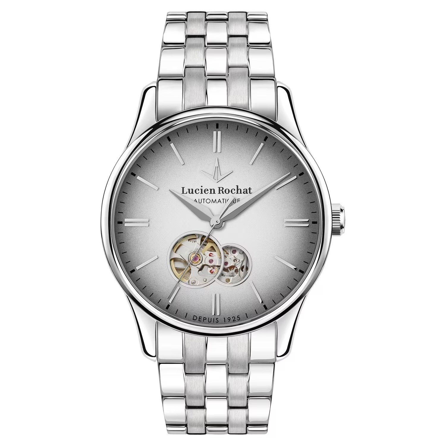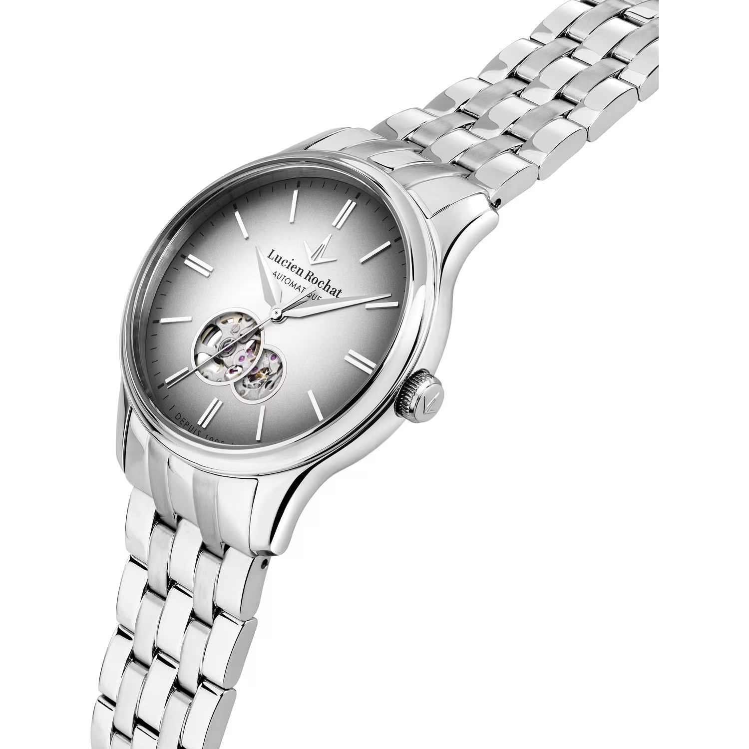 Orologio uomo lucien rochat, R0423115006, collezione montreux, movimento automatico, solo tempo, cassa in acciaio 39mm, quadrante ombrè argento con movimento a vista, vetro zaffiro, fondello a vite, bracciale in acciaio, resistenza all'acqua 3atm