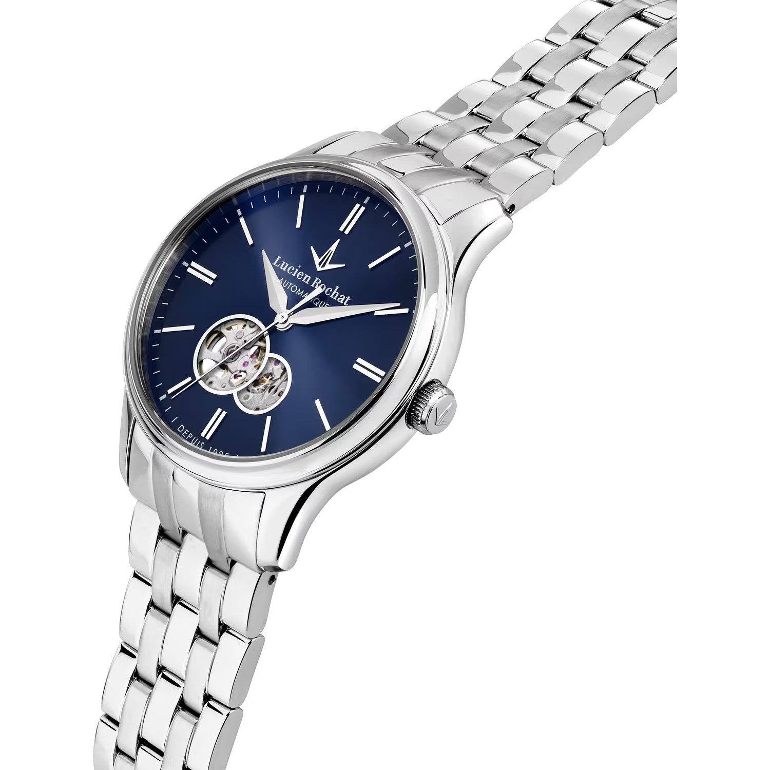 Orologio uomo lucien rochat, R0423115007, collezione montreux, movimento automatico, solo tempo, cassa in acciaio 39mm, quadrante blu con movimento a vista, vetro zaffiro, fondello a vite, bracciale in acciaio, resistenza all'acqua 3atm