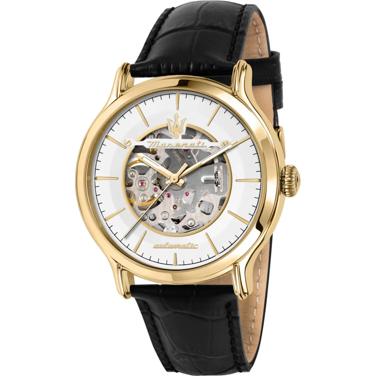 Orologio uomo maserati, R8821118011, collezione epoca, movimento automatico, solo tempo, cassa in acciaio dorato 42mm, quadrante con movimento a vista, fondello e corona a vite, vetro trattamento sapphire coated, cinturino in pelle, resistenza all'acqua 10atm