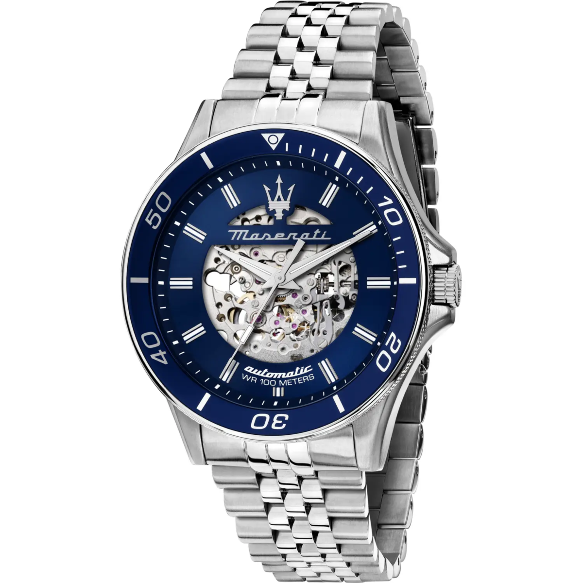 Orologio uomo maserati, R8823140011, collezione sfida, movimento automatico, solo tempo, cassa in acciaio 44mm, quadrante con movimento a vista, fondello e corona a vite, vetro con trattamento sapphire coated, bracciale in acciaio, resistenza all'acqua 10atm